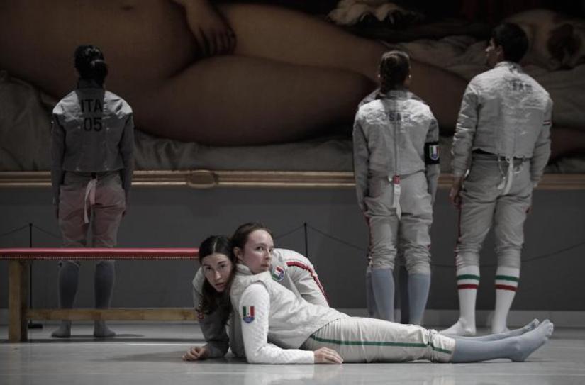 A nyitókép műfűhöz hasonló zöld négyszögének szélein hat szék; az egyik oldalon három feketébe öltözött férfi, szemben pedig, rövid fehér ruhácskában, két leány.